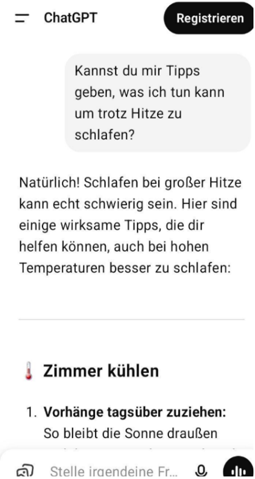Im Anschluss hat die sozialpädagogische Fachkraft mit der Klientin besprochen, welche nächsten Schritte noch möglich wären. Die Fachkraft begleitete die Klienten später dann beim Kauf eines Ventilators. Bei der Minijob-Suche wurde eine Jugendliche mit Hilfe von ChatGPT fündig und stellte ihre Bewerbungsunterlagen mit Unterstützung von ChatGPT zusammen.