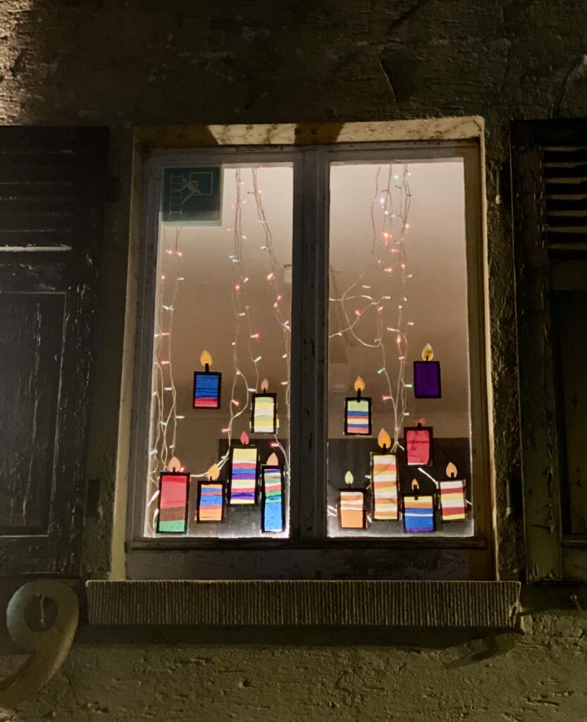 Beim lebendigen Adventskalender hat jedes Kind eine individuelle Kerze gestaltet: klein, groß, schmal oder breit, bunt oder schlicht. Dies soll symbolisieren, dass wir Menschen alle unterschiedlich sind aber unser Licht gemeinsam leuchten kann.