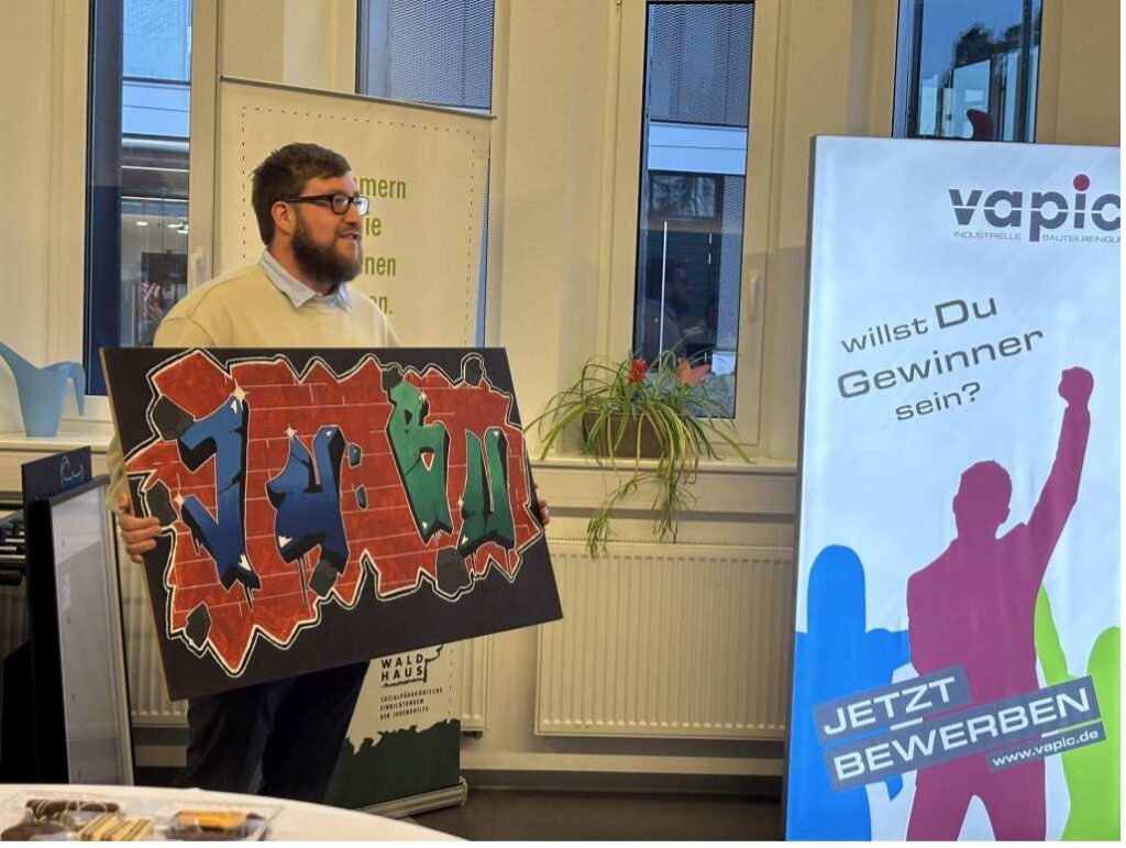Zur Spendenübergabe waren zahlreiche Jugendliche ins Jugendhaus gekommen. Begrüßt wurden sie von Jugendhausleiter André Wichert sowie Vertretern des Trägers Stadt Neubulach, Stadtrat Herrn Ahsbahs, Waldhaus mit Geschäftsführer Phillip Löffler und Bereichsleiter Michael Groh sowie seitens vapic vom geschäftsführenden Gesellschafter Samuel Wolf und Marketingleiterin Bettina Kern. Auch Jule Adam und Sabine Huber von der Jugendsozialarbeit freuten sich über die Unterstützung.
